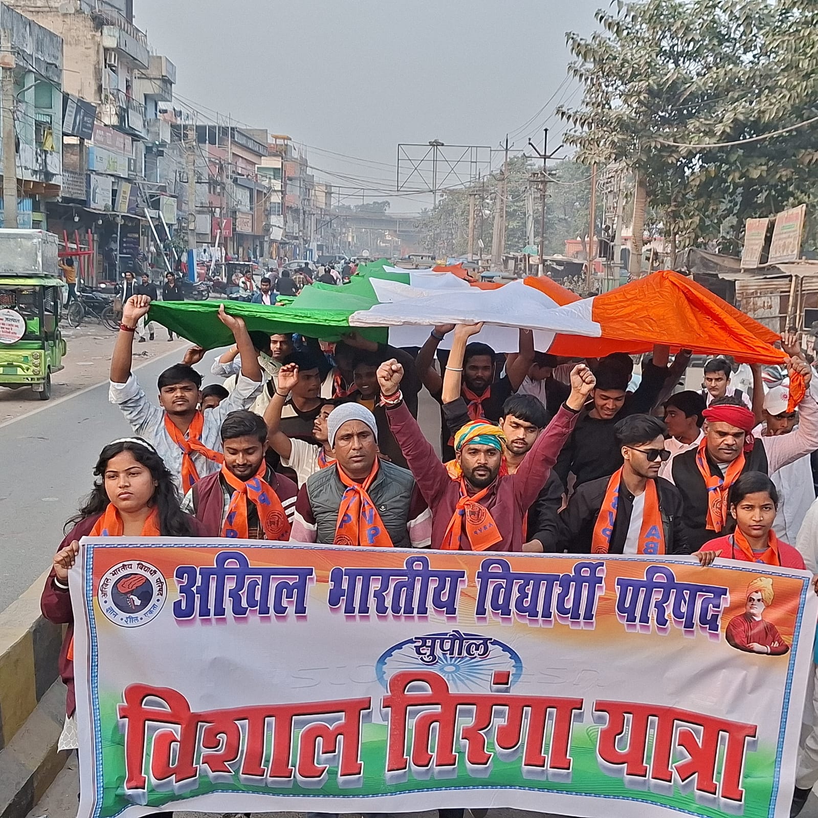 सुपौल में राष्ट्रभक्ति का सैलाब: एबीवीपी की विशाल तिरंगा यात्रा में उमड़ा युवा जोश, नगर गूंजा ‘भारत माता की जय’ से