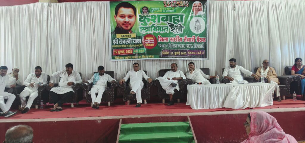 सामाजिक न्याय और कुशवाहा समाज की राजनीतिक भागीदारी को लेकर आगामी 15 जुलाई को सिमराही के लखीचंद साहू हाई स्कूल के मैदान में ‘कुशवाहा स्वाभिमान रैली’ का भव्य आयोजन किया जाएगा। इस ऐतिहासिक रैली में बिहार विधानसभा में नेता प्रतिपक्ष तेजस्वी यादव मुख्य अतिथि के रूप में शामिल होंगे। इसको लेकर शुक्रवार को राघोपुर प्रखंड के सिमराही स्थित एक निजी होटल में जिलास्तरीय तैयारी बैठक का आयोजन किया गया।