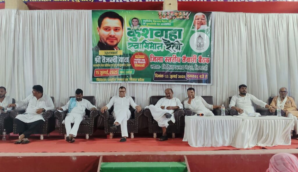 सामाजिक न्याय और कुशवाहा समाज की राजनीतिक भागीदारी को लेकर आगामी 15 जुलाई को सिमराही के लखीचंद साहू हाई स्कूल के मैदान में ‘कुशवाहा स्वाभिमान रैली’ का भव्य आयोजन किया जाएगा। इस ऐतिहासिक रैली में बिहार विधानसभा में नेता प्रतिपक्ष तेजस्वी यादव मुख्य अतिथि के रूप में शामिल होंगे। इसको लेकर शुक्रवार को राघोपुर प्रखंड के सिमराही स्थित एक निजी होटल में जिलास्तरीय तैयारी बैठक का आयोजन किया गया।