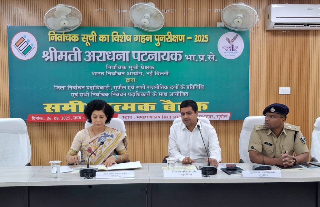 बैठक के दौरान प्रेक्षक अराधना पटनायक ने राजनीतिक दलों के प्रतिनिधियों से प्रारूप सूची प्रकाशन के बाद की गई कार्रवाई, मतदाता पंजीकरण की स्थिति, और दावा-आपत्ति निस्तारण की प्रक्रिया पर जानकारी ली। सभी दलों के प्रतिनिधियों ने बताया कि सुपौल जिले के पांच विधानसभा क्षेत्रों में निर्वाचन आयोग के दिशा-निर्देशों के अनुरूप कार्य सुव्यवस्थित ढंग से और बिना किसी रुकावट के चल रहे हैं। उन्होंने यह भी स्पष्ट किया कि इस प्रक्रिया के संबंध में अब तक किसी प्रकार की शिकायत सामने नहीं आई है।
