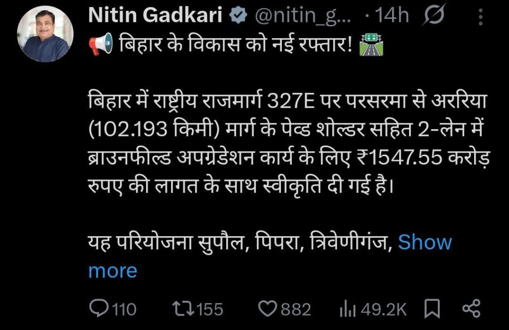 केंद्रीय सड़क परिवहन और राजमार्ग मंत्री नितिन गडकरी ने एक्स (पूर्व में ट्विटर) पर ट्वीट करते हुए इस बात की जानकारी दी। उन्होंने लिखा कि यह परियोजना बिहार में कनेक्टिविटी को मजबूती प्रदान करेगी और क्षेत्रीय विकास को नई रफ्तार देगी।