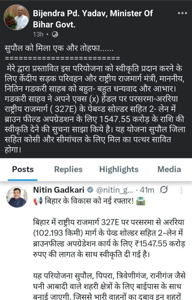 वहीं केंद्रीय सड़क परिवहन और राष्ट्रीय राजमार्ग मंत्री नितिन गडकरी का आभार जताते हुए ऊर्जा मंत्री बिजेंद्र प्रसाद यादव ने कहा कि मेरे द्वारा प्रस्तावित इस परियोजना को स्वीकृति प्रदान करने के लिए केंद्रीय सड़क परिवहन और राष्ट्रीय राजमार्ग मंत्री, माननीय नितिन गडकरी जी को मैं हृदय से बहुत-बहुत धन्यवाद और आभार प्रकट करता हूँ। गडकरी जी ने अपने एक्स (X) हैंडल पर परसरमा–अररिया राष्ट्रीय राजमार्ग (NH-327E) के पेव्ड शोल्डर सहित 2-लेन में ब्राउनफील्ड अपग्रेडेशन हेतु ₹1547.55 करोड़ की राशि स्वीकृत किए जाने की जानकारी साझा की है। यह योजना सुपौल जिला सहित कोसी और सीमांचल क्षेत्र के लिए विकास की दिशा में एक मील का पत्थर साबित होगी।
