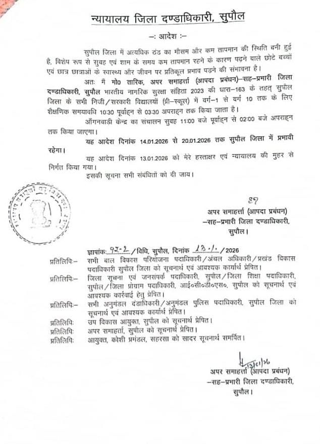 प्रभारी डीएम के द्वारा जारी आदेश के अनुसार, सुपौल जिले के सभी निजी एवं सरकारी विद्यालयों (प्री-स्कूल) में कक्षा 1 से कक्षा 10 तक की शैक्षणिक गतिविधियां अब सुबह 10:30 बजे से अपराह्न 3:30 बजे तक संचालित होंगी। वहीं, आंगनबाड़ी केंद्रों का संचालन सुबह 11:00 बजे से दोपहर 2:00 बजे तक किया जाएगा।