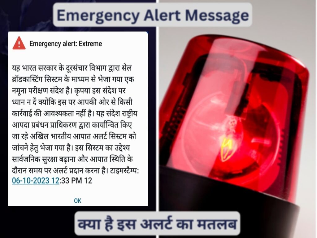 इस अलर्ट को इमरजेसी अलर्ट प्रोसेस को चेक करने के लिए भेजा गया है। यह एक टेस्ट मैसेज है। मैसेज पर भी यह साफ लिखा है कि यह एक टेस्ट सैंपल मैसेज है। टेलिकॉम डिपार्टमेंट ने कहा है कि अलग-अलग मोबाइल ऑपरेटरों और सेल ब्रॉडकास्ट सिस्टम की इमरजेंसी अलर्ट ब्रॉडकास्टिंग क्षमता को चेक करने के लिए यह टेस्टिंग समय-समय पर देश भर के अलग-अलग क्षेत्रों में किए जाएंगे।