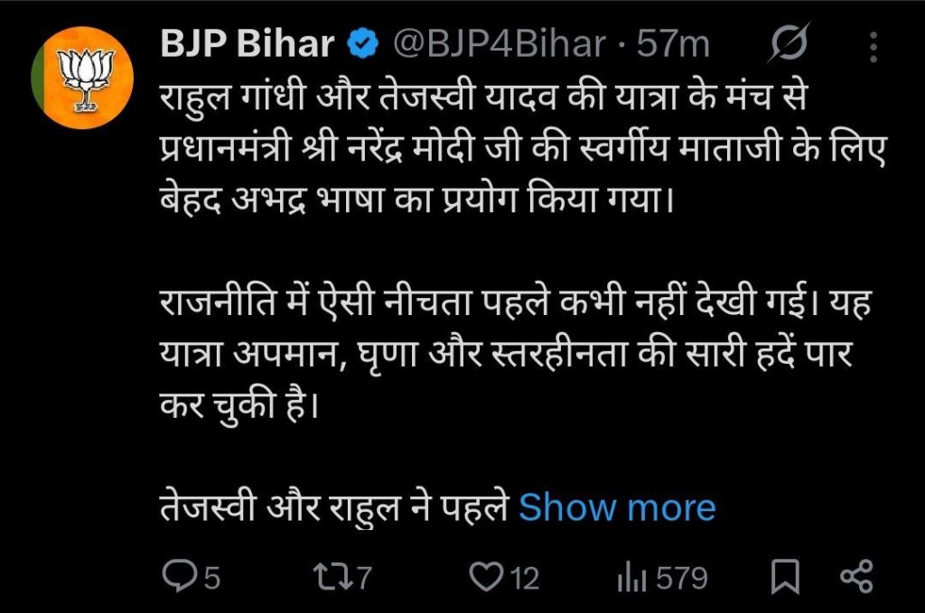 “राहुल गांधी और तेजस्वी यादव की यात्रा के मंच से प्रधानमंत्री श्री नरेंद्र मोदी जी की स्वर्गीय माताजी के लिए बेहद अभद्र भाषा का प्रयोग किया गया। राजनीति में ऐसी नीचता पहले कभी नहीं देखी गई। यह यात्रा अपमान, घृणा और स्तरहीनता की सारी हदें पार कर चुकी है।”