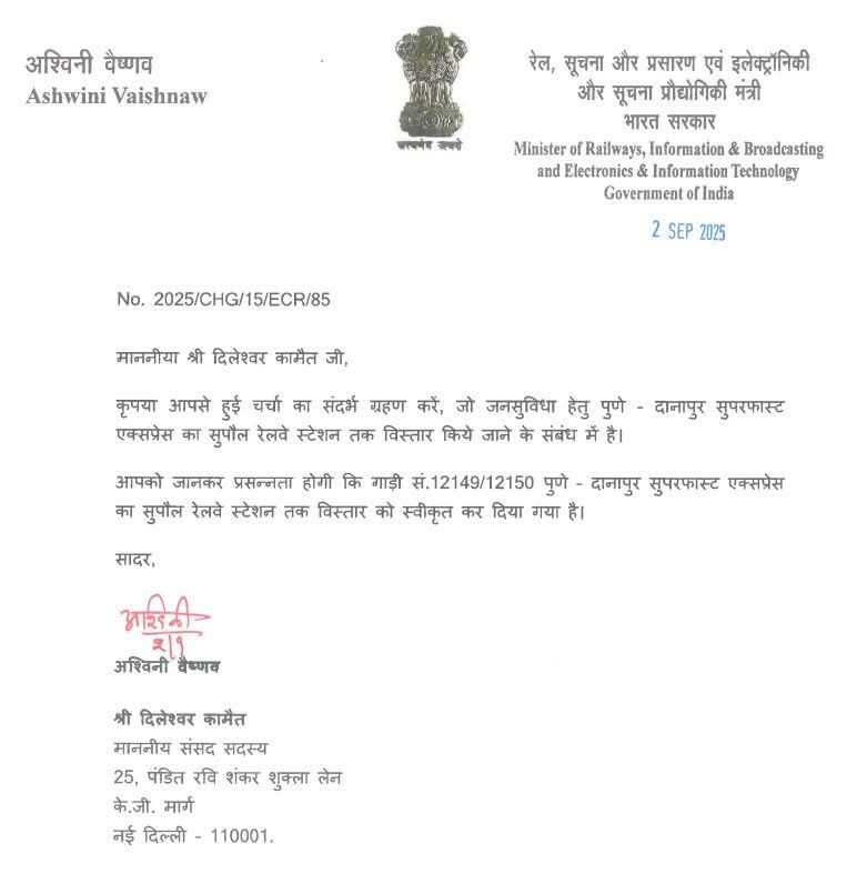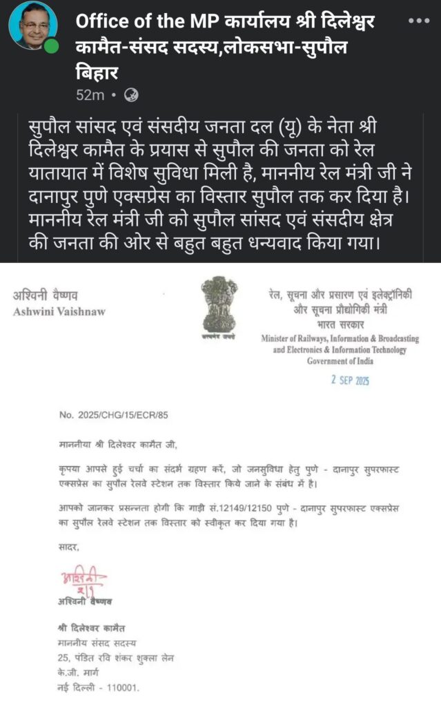 जिले के लोगों के लिए एक बड़ी खुशखबरी सामने आई है। लंबे समय से चली आ रही मांग को आखिरकार रेल मंत्रालय ने पूरा कर दिया है। अब सुपौल से सीधे पुणे तक रेल सेवा की सुविधा उपलब्ध होगी। सांसद दिलेश्वर कामैत की लगातार पहल और मांग पर दानापुर–पुणे सुपरफास्ट एक्सप्रेस (12149/50) का विस्तार सुपौल तक कर दिया गया है।
