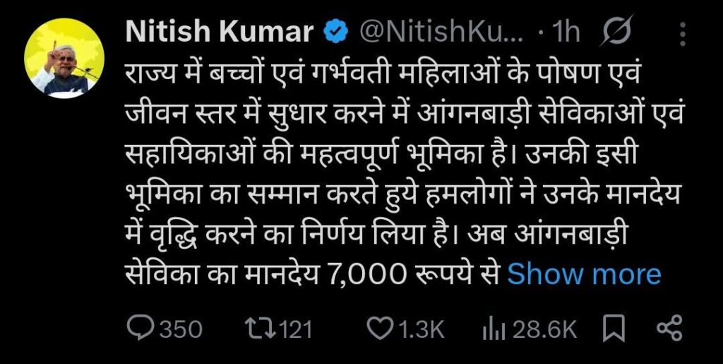 बिहार में चुनाव से पहले नीतीश सरकार का तोहफा, आंगनबाड़ी सेविका-सहायिकाओं के मानदेय में बढ़ोतरी