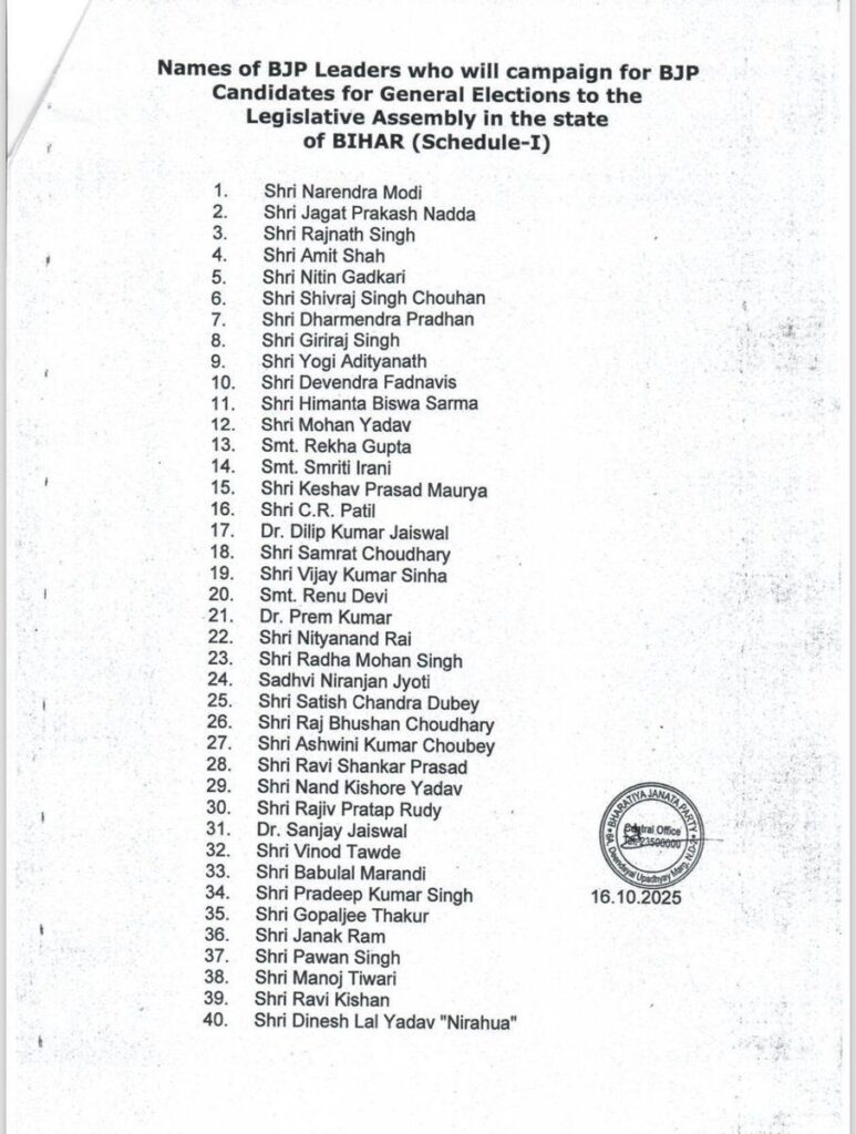बिहार विधानसभा चुनाव 2025 : बीजेपी ने जारी की स्टार प्रचारकों की पहली सूची, पीएम मोदी से लेकर योगी तक 40 नाम शामिल