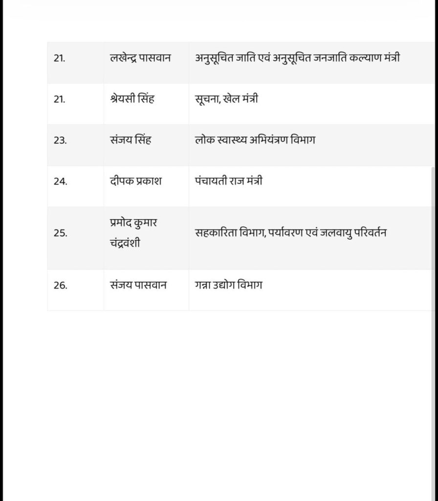- LJP(आर) कोटे से – गन्ना उद्योग विभाग, लोक स्वास्थ्य अभियंत्रण विभाग