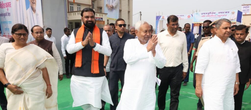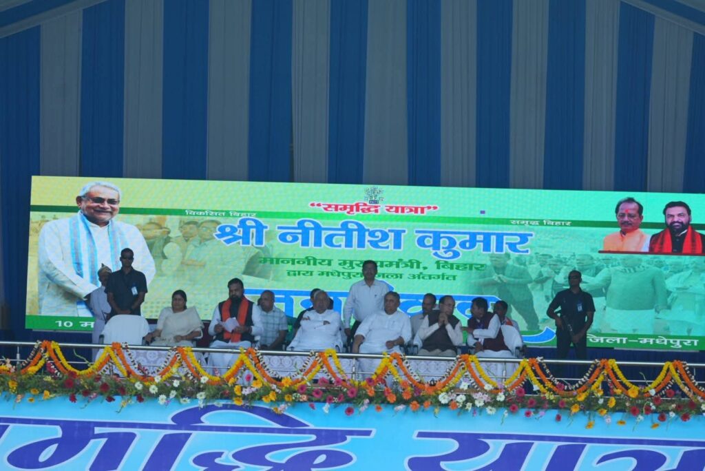 बिहार के मुख्यमंत्री नीतीश कुमार मंगलवार को ‘समृद्धि यात्रा’ के तीसरे चरण के तहत सुपौल के बाद मधेपुरा पहुंचे, जहां उन्होंने एक बड़ी जनसभा को संबोधित किया। कार्यक्रम के दौरान मुख्यमंत्री ने प्रदेश में हुए विकास कार्यों, बेहतर होती प्रशासनिक व्यवस्था तथा वर्ष 2005 के बाद राज्य में आए बदलावों का विस्तार से उल्लेख किया। हालांकि पूरे संबोधन के दौरान उन्होंने राज्यसभा जाने से जुड़े सवाल पर कोई प्रतिक्रिया नहीं दी, जिससे राजनीतिक हलकों में तरह-तरह की अटकलें तेज हो गई हैं।