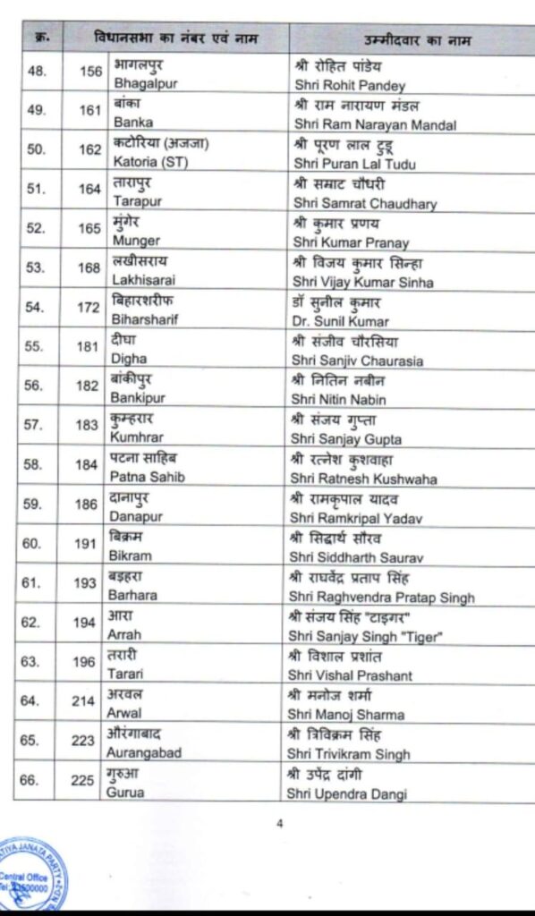 सूत्रों के अनुसार, इस बार पार्टी ने कई पुराने चेहरों पर पुनः भरोसा जताया है, वहीं कुछ वरिष्ठ नेताओं के टिकट काटे गए हैं। पटना साहिब से विधायक और राज्य के वरिष्ठ नेता नंद किशोर यादव का टिकट काटा जाना राजनीतिक हलकों में चर्चा का विषय बन गया है।