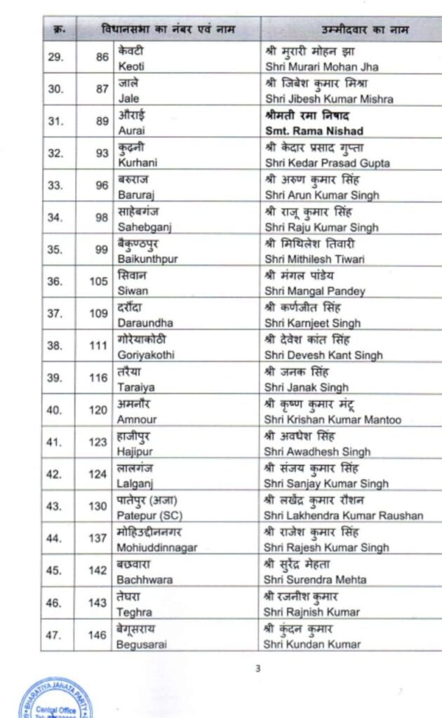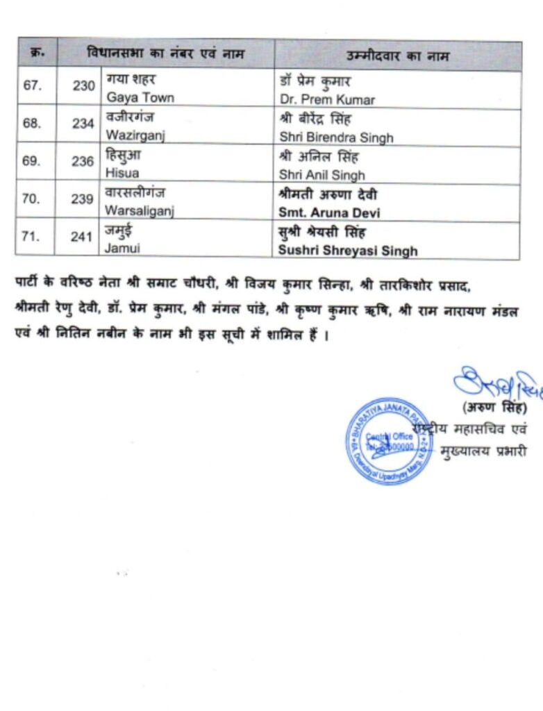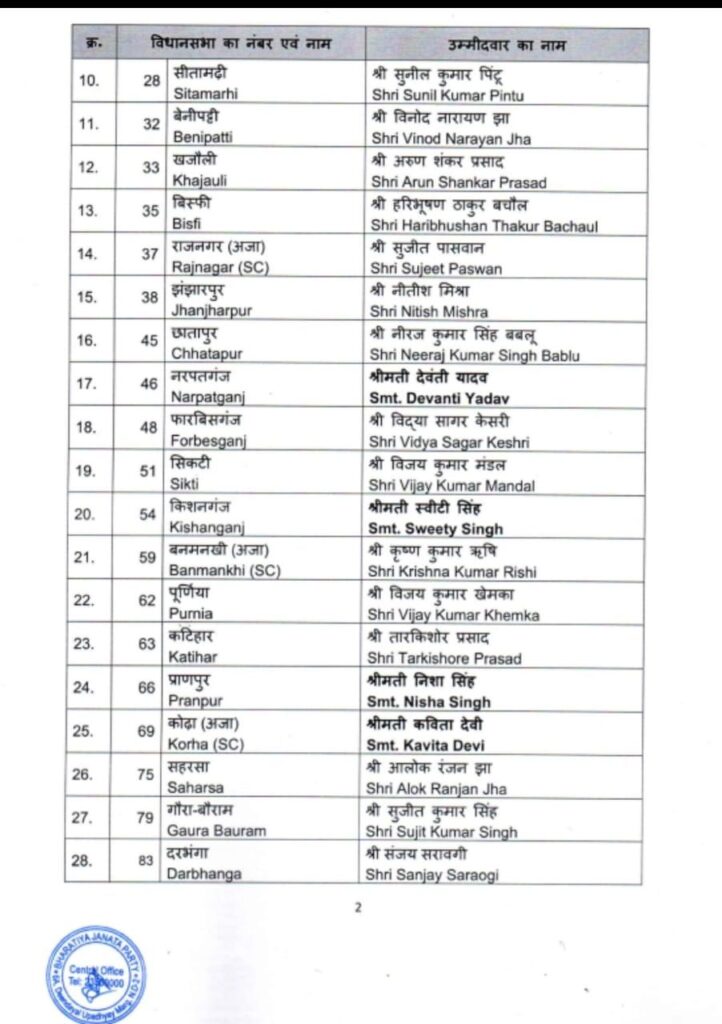 एनडीए में सीट शेयरिंग समझौते के अनुसार, भाजपा को कुल 101 सीटें मिली हैं। पार्टी की शेष 30 सीटों पर उम्मीदवारों के नाम दूसरी सूची में घोषित किए जाएंगे।