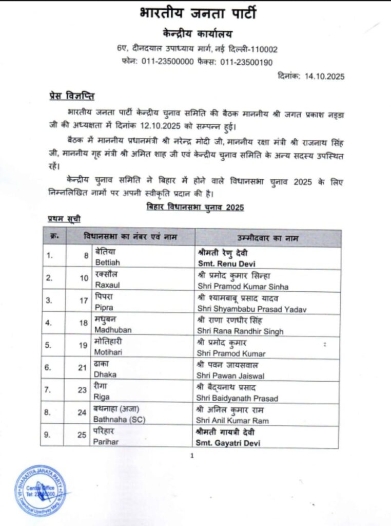 चुनावी हलचल के बीच बिहार विधानसभा चुनाव 2025 को लेकर भारतीय जनता पार्टी (भाजपा) ने मंगलवार, 14 अक्टूबर को अपनी पहली उम्मीदवार सूची जारी कर दी है। इस पहली सूची में कुल 71 प्रत्याशियों के नामों की घोषणा की गई है।
